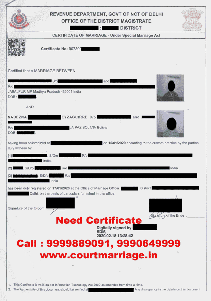 For Marriage Registration under Hindu Act: You can apply at office of the Sub-Divisional Magistrate in whose jurisdiction the marriage was solemnized or the husband or wife resides on any working day. Fill the Application form duly signed by both husband and wife. Verification of all the documents is carried out on the date of application and a day is fixed for the appointment and communicated to the parties for registration. On the said day, both parties, along with two witnesses, need to be present before the ADM. The Certificate is issued on the same day.